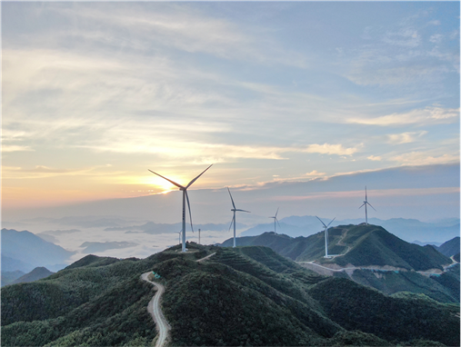 旭日喷薄而出,晨光下的芙蓉山,连绵青翠,云雾缭绕,风车悠然而立,似真似幻宛如仙境。(市城建投 张晓韧 摄)