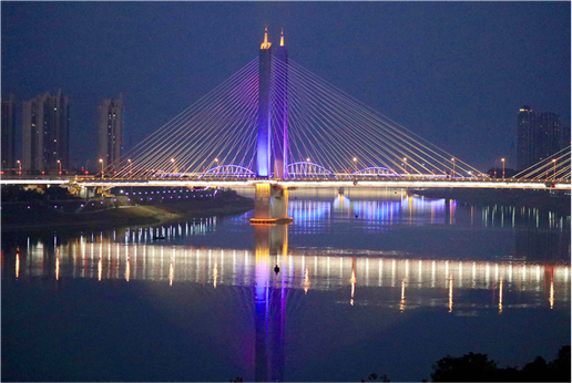 益阳西流湾大桥横跨资江,主塔为“凤凰展翅”造型,夜晚,看着大桥和楼房的灯光变幻,浪漫满怀。(赫山区纪委监委 郭蓉 摄)