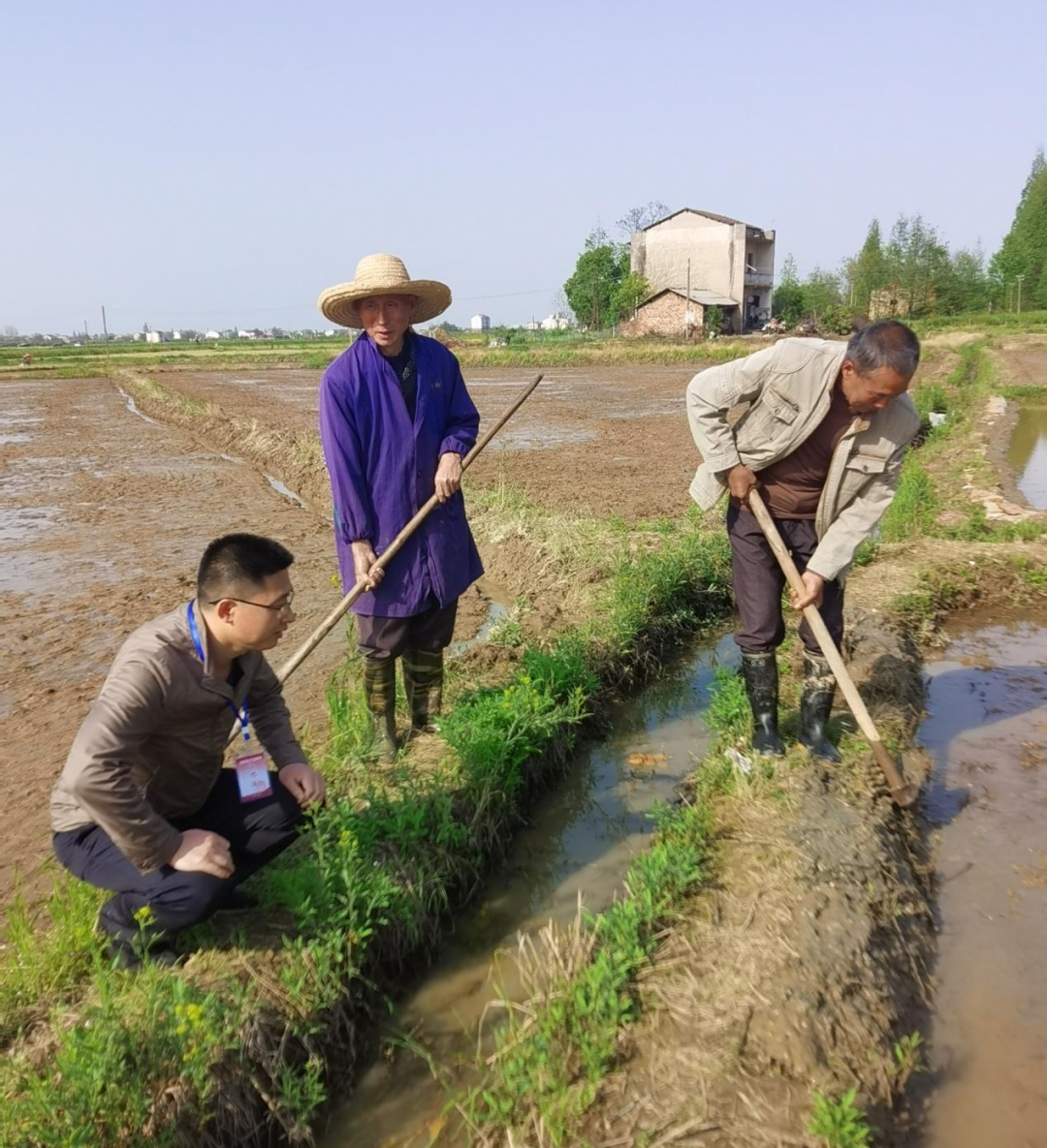 赫山区纪委监委以“三湘护农”专项行动为契机,围绕稳定粮食生产水利工作重点,调研目前春耕生产的水利设施建设情况。图为纪检监察干部在兰溪镇小河口村察看灌溉用水情况。(赫山区纪委监委 李永 摄)