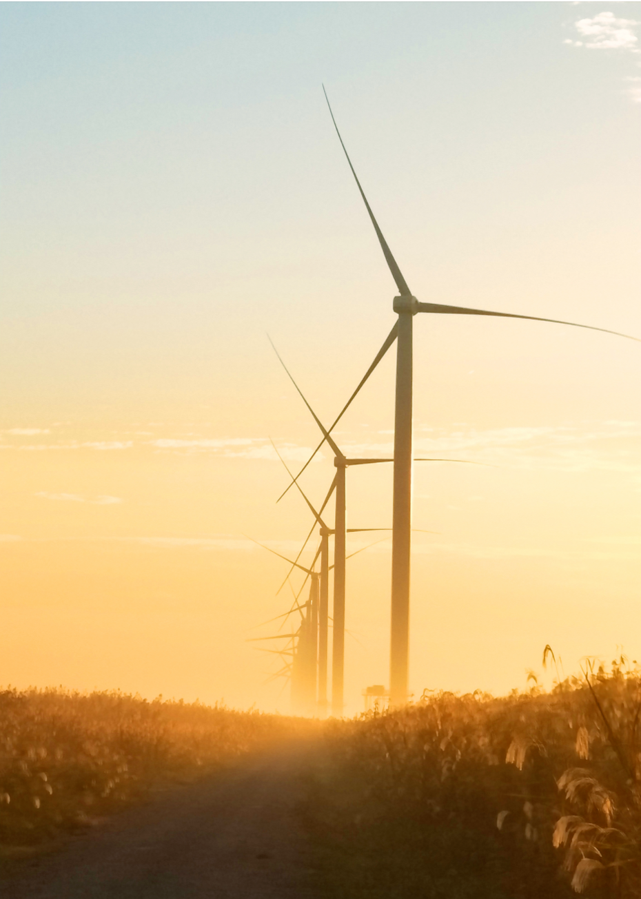冬日清晨,沅江市漉湖的风力发电机屹立在晨曦中,晨光透过薄雾,湖洲上遍地芦花被镀上了一层金色。(沅江市纪委监委供 佘小林 摄)