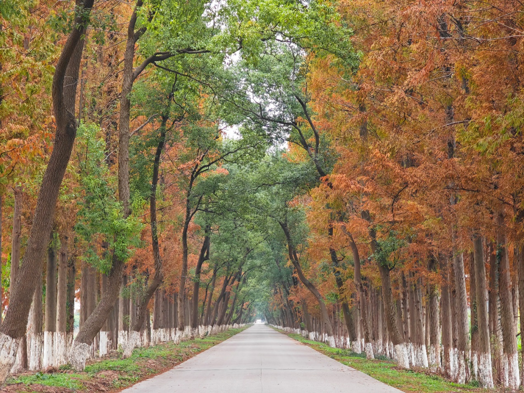 冬日水杉换上红装,树下的小路径直向前,仿佛通向一个充满宁静与美好的世外桃源。(大通湖区千山红镇纪委供 王芳 摄)