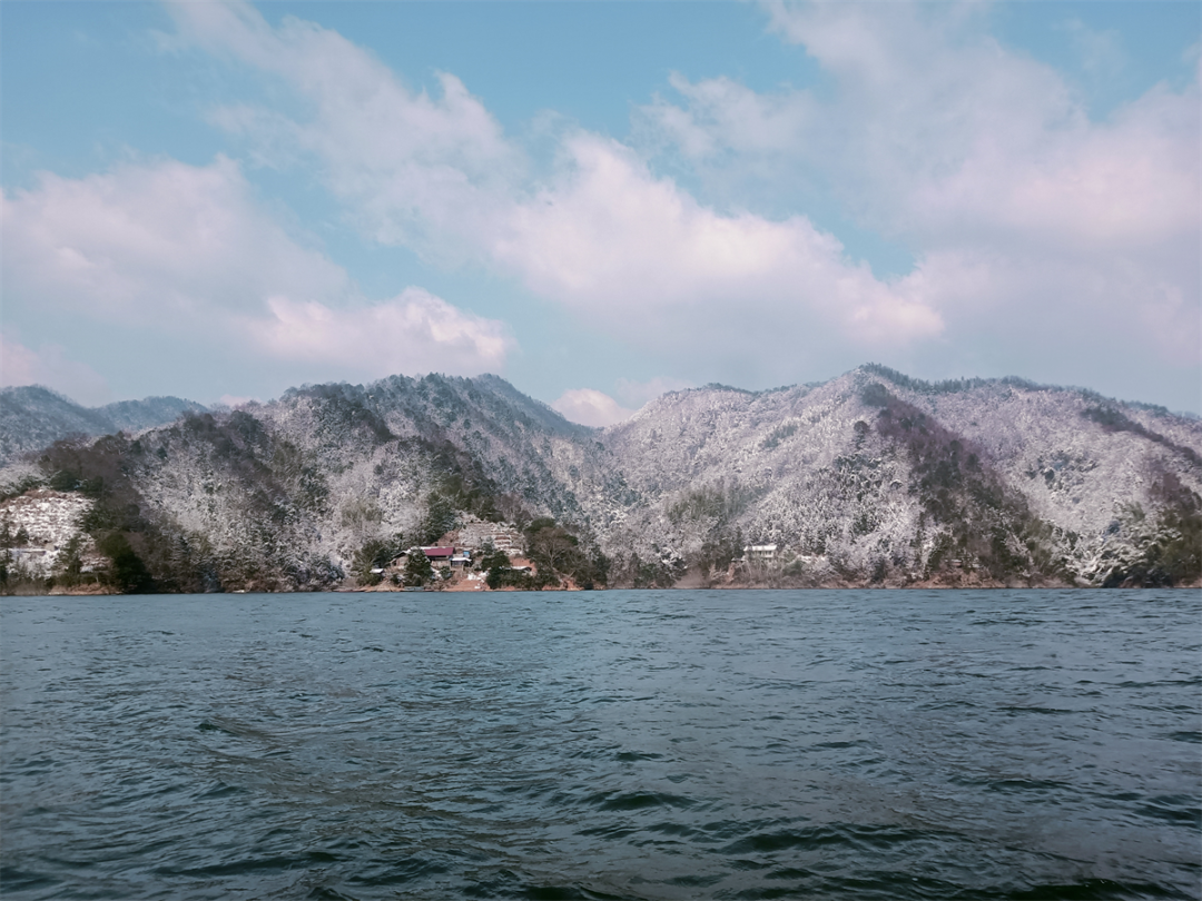 安化县南金乡毗溪河在澄澈天空的照映下,河水如深邃的墨玉,银装素裹的山峰似起伏的玉龙,静静述说岁月的低语。(安化县南金乡供 朱艳 摄)