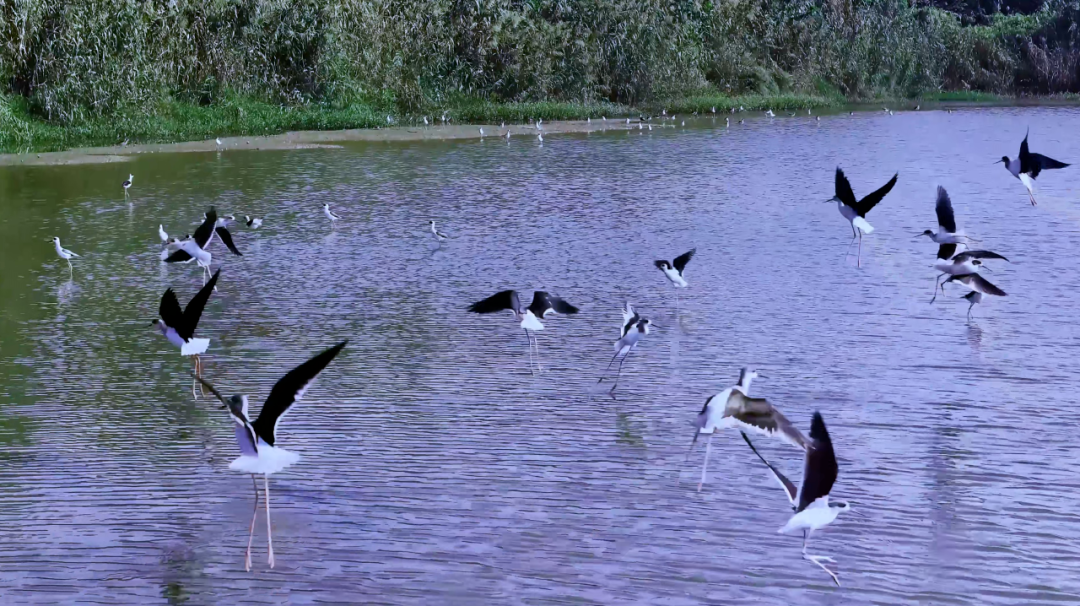 在大通湖区的大嘴巴观景台,近千只黑翅长脚鹬翩然起舞,时而轻盈翻飞,时而悠然踱步于浅水之间,长喙如探针般在水中扫荡觅食,构成一幅生机盎然的湿地生态图景。(大通湖区融媒体中心供 陈邹恒 摄)