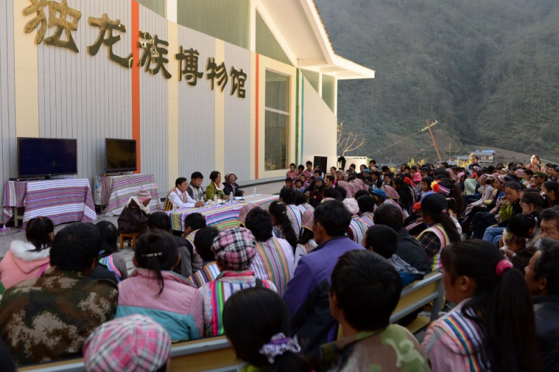 受到习近平总书记会见的贡山县干部群众代表回到独龙江乡,在新修起的独龙族博物馆前用汉语和独龙语向数百名独龙族群众宣讲总书记的讲话内容(2015年1月22日摄)。新华社记者 胡超 摄