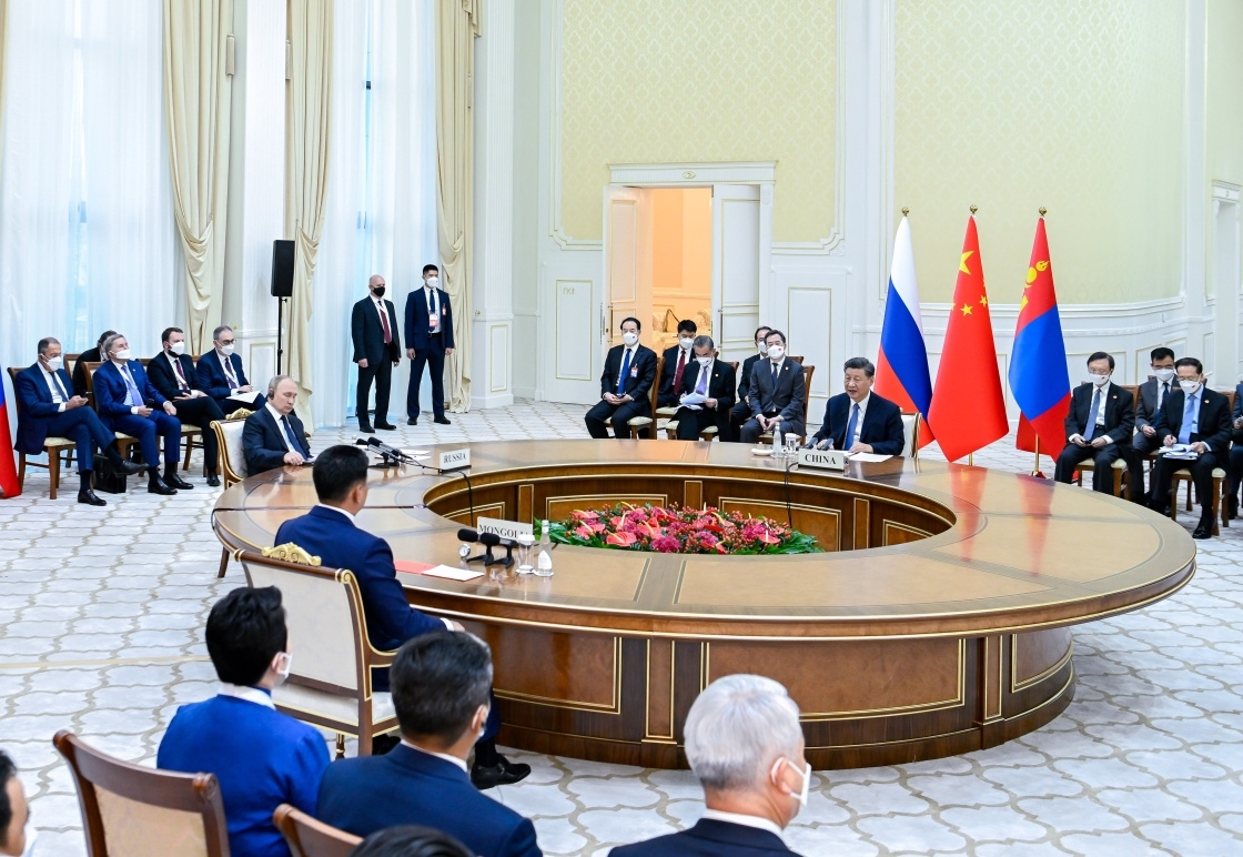 当地时间9月15日下午,国家主席习近平在撒马尔罕国宾馆同俄罗斯总统普京、蒙古国总统呼日勒苏赫举行中俄蒙三国元首第六次会晤。新华社记者 翟健岚 摄