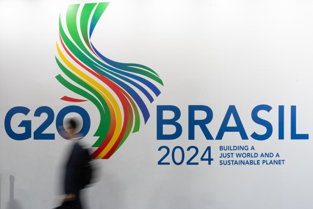 2月21日,在巴西里约热内卢,一名男子经过G20标识。新华社记者王天聪摄