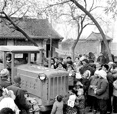 1958年,中国第一台履带式拖拉机“东方红”开进村庄。