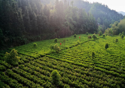 从安化县田庄乡南部香岩村最高峰放眼北望,层峦叠嶂,有机茶园,青翠欲滴。(安化县田庄乡纪委供 李威 摄)