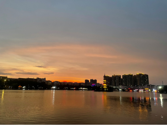 湖面柔波微漾,落日晚霞将天空染成了烟红色。(南县纪委监委供 尹诗涵 摄)