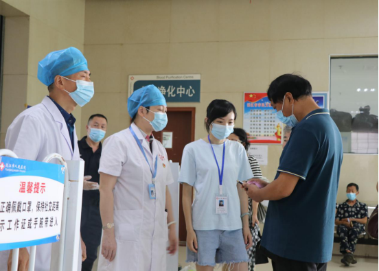 沅江市人民医院纪委工作人员定期对医院各科室消杀、三码联查、防护措施佩戴情况进行督查。图为市人民医院纪委工作人员在住院部督查入院患者及家属防护措施落实情况。(沅江市纪委监委供 黎玉环 摄)