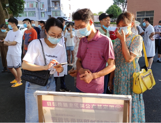 沅江市新湾镇纪委干部帮助准备接种新冠疫苗的群众扫健康码。(沅江市新湾镇纪委供 黄照 摄)