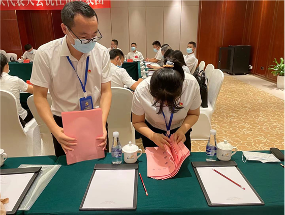 ▲随团工作人员清点《严肃换届纪律承诺书》收集情况