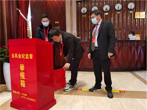 在会场和代表、委员驻地酒店,全面公布省委督导组联系方式和市两会会风会纪监督公告、举报电话,设置中央、省委、市委关于换届纪律要求的宣传牌和信访举报箱。