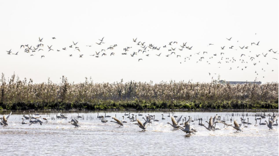 南县天星洲,北雁南归的候鸟振翅起舞,为冬日增添了一道靓丽的风景。(南县纪委监委供 易立新 摄)