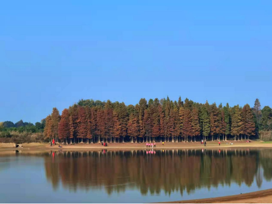 天蓝如洗,水清如碧,沅江市胭脂湖红杉倒映成画,装点出一处独特的寒冬美景,吸引游客纷至沓来。(沅江市纪委监委驻市委宣传部纪检监察组供 成琳 摄)