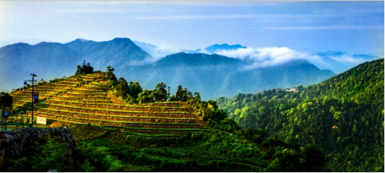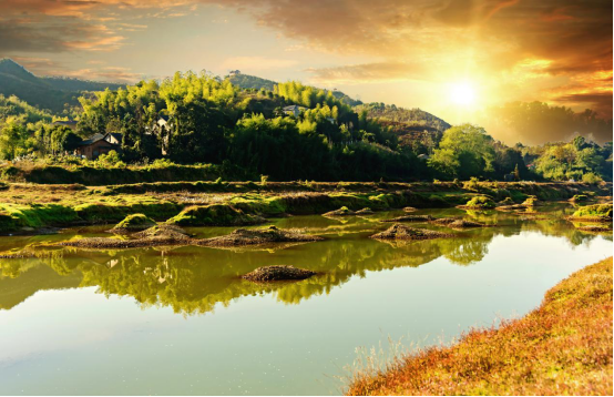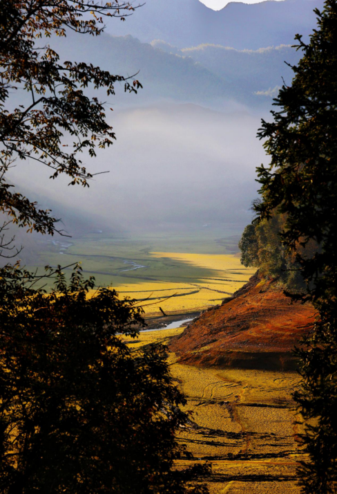 缕缕朝霞洒在金黄的田垄上,远远的青山与云彩相映成诗。(市住房公积金管理中心供 刘倩 摄)