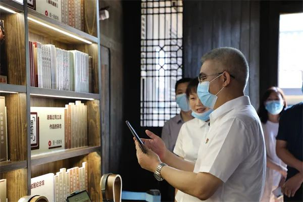 欧阳艳在周立波故居手机扫码体验有声读书,从周立波先生文学作品中感悟廉洁精神。