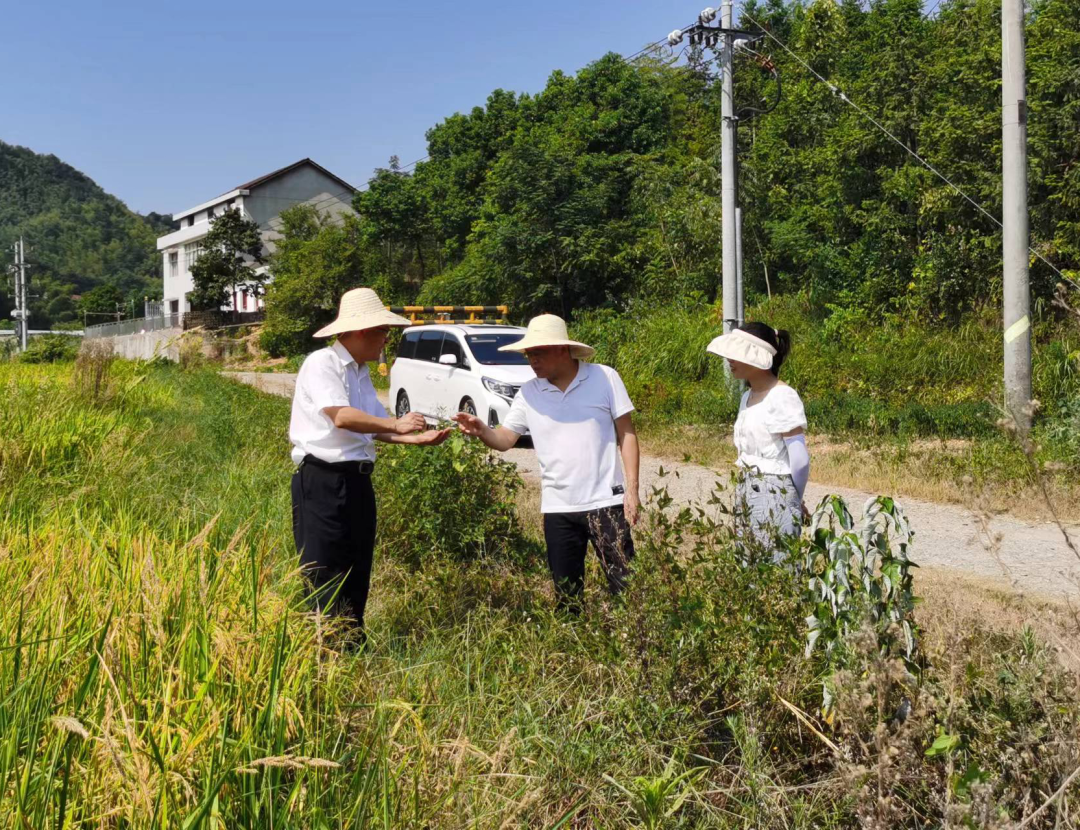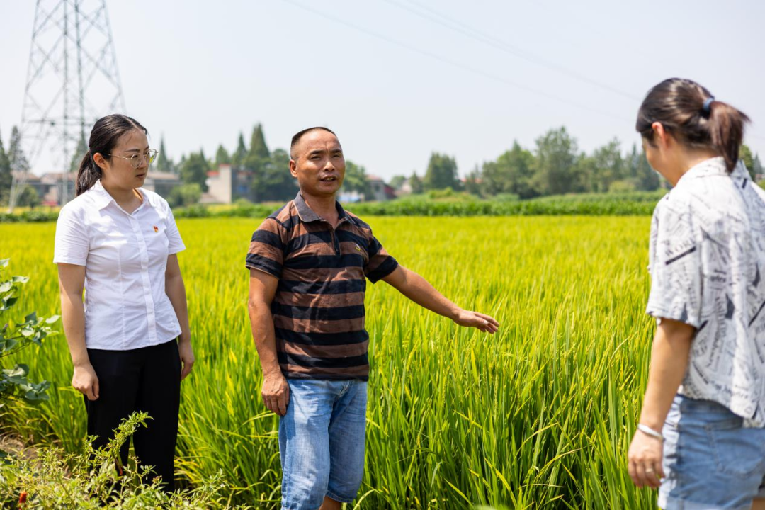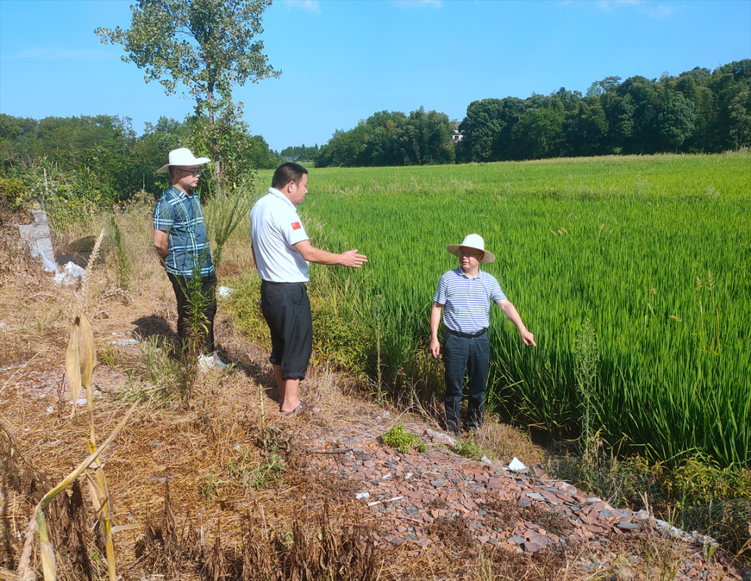 南县各乡镇纪委靠前监督,督促职能部门做好抗旱保供水,积极组织动员群众开展生产自救。图为该县中鱼口镇纪委工作人员到同湖村查看水稻生长情况,向粮农了解供水措施是否落实。(南县纪委监委 杨子江 摄)