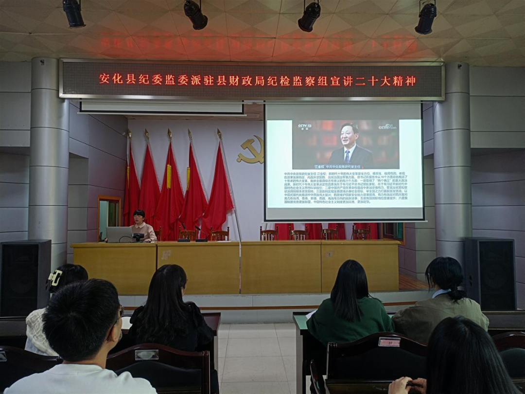 安化县纪委监委驻县财政局纪检监察组组织县财政局机关纪委及相关股室工作人员,通过观看视频、提问互动、分组讨论等形式,学习领会党的二十大精神。