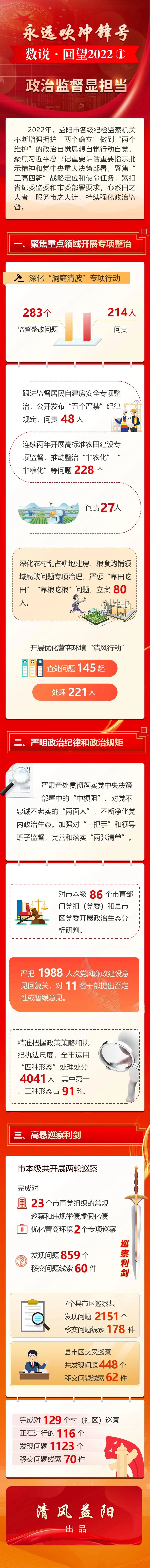 编者按:2022年以来,全市纪检监察机关紧跟党中央决策部署,紧扣中心大局,紧贴民生民心,坚守初心使命,忠诚履职尽责,坚定不移正风肃纪反腐,不断推进纪检监察工作高质量发展,在全面建设现代化新益阳实践中彰显纪检担当。“清风益阳”推出《数说·回望2022》系列长图,亮出2022年纪检监察工作成绩单,迎接益阳市七届纪委三次全会召开。