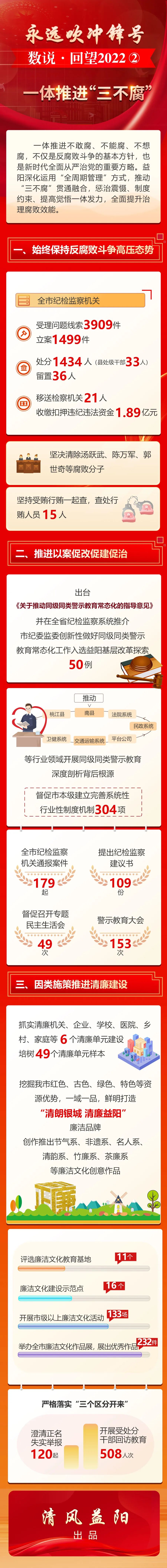 编者按:2022年以来,全市纪检监察机关紧跟党中央决策部署,紧扣中心大局,紧贴民生民心,坚守初心使命,忠诚履职尽责,坚定不移正风肃纪反腐,不断推进纪检监察工作高质量发展,在全面建设现代化新益阳实践中彰显纪检担当。“清风益阳”推出《数说·回望2022》系列长图,亮出2022年纪检监察工作成绩单,迎接益阳市七届纪委三次全会召开。