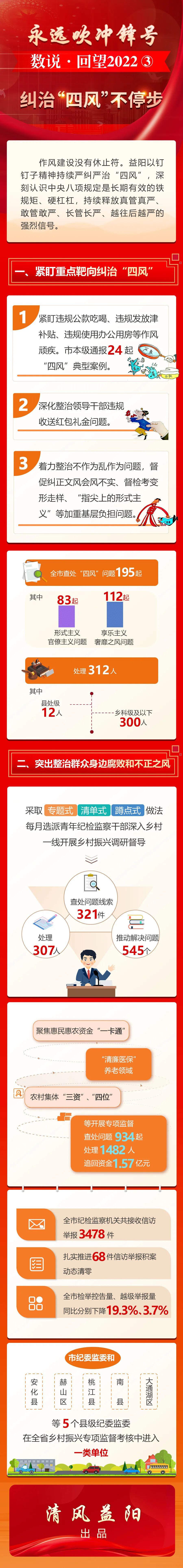 编者按:2022年以来,全市纪检监察机关紧跟党中央决策部署,紧扣中心大局,紧贴民生民心,坚守初心使命,忠诚履职尽责,坚定不移正风肃纪反腐,不断推进纪检监察工作高质量发展,在全面建设现代化新益阳实践中彰显纪检担当。“清风益阳”推出《数说·回望2022》系列长图,亮出2022年纪检监察工作成绩单,迎接益阳市七届纪委三次全会召开。