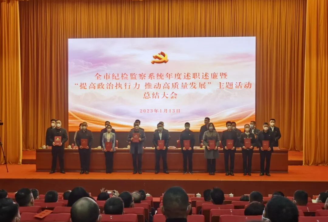 1月13日,全市纪检监察系统年度述职述廉暨“提高政治执行力 推动高质量发展”主题活动总结大会召开,对评选出的“十大特色亮点工作”“十大精品案件”和“双十佳业务能手”进行表彰,会场内气氛热烈,掌声不断。