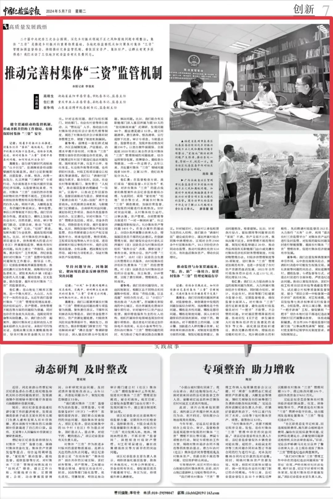 高靖生:我们以部署开展农村集体“三资”管理突出问题治理专项监督为统揽,聚焦责任落实、干部作风和廉洁风险等重点,紧盯资金监管不到位、资产资源处置随意、村级债务风险突出等薄弱环节,精准发力、持续发力。联合职能部门探索实行“驻场解剖麻雀”“蹲点监督”等调研督导方法,深入基层和群众中发现问题、解决问题。比如,我们联合有关职能部门深入基层开展为期10天的“驻场解剖麻雀”式调研,发现问题44个,提出意见建议12条。建立问题清单、责任清单、整改清单,实行巡察下沉查、审计专项查、专班重点查、监督常态查,发现并推动整改问题296个。以查办案件强震慑,全面起底2020年底以来全市涉及村集体“三资”管理领域的问题线索,综合运用领导包案、挂牌督办、提级查办等措施,一件一件过筛子。去年以来,共处置村集体“三资”领域问题线索108件,立案32件,党纪政务处分35人。