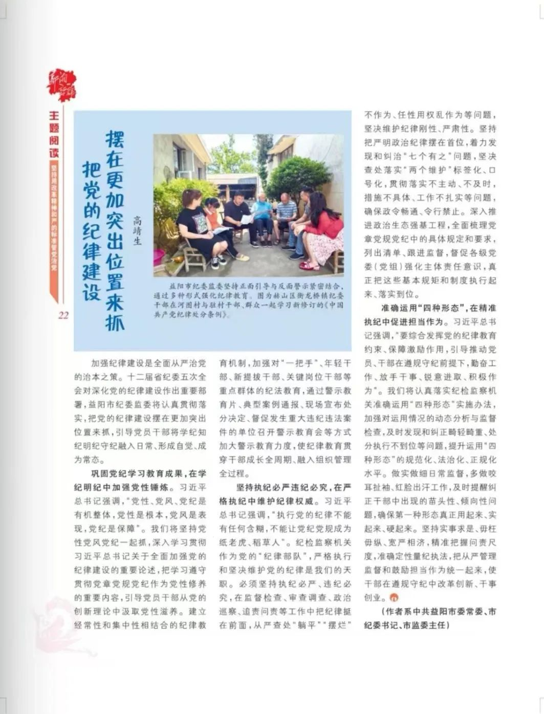 《新湘评论》2025年第5期刊发益阳市委常委、市纪委书记、市监委主任高靖生署名文章《把党的纪律建设摆在更加突出位置来抓》。全文如下: