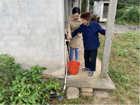 图为南嘴镇纪委工作人员在回访中,贫困户曾瑞先老人高兴地向她展示家里自来水。