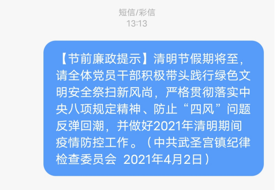 “每次一到节假日,手机里就会收到镇纪委发来的节前廉政提示,提早为我们廉洁过节敲响警钟。”4月2日,南县武圣宫镇机关党员叶淡的手机里一条信息如约而至。