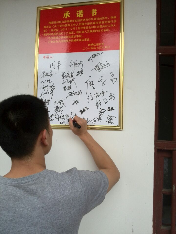 为落实中央、省市相关规定,严格规范全镇党员干部操办婚丧和其他喜庆事宜,倡导移风易俗,促进全镇党风廉政建设,沅江市四季红镇开展党员干部签名承诺活动。