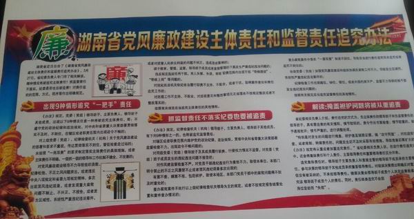 沅江市庆云山街道自湖南省落实党风廉政主体责任监督责任追究办法电视电话会议后,街道工委高度重视,相继召开街道班子人员和街道社区村干部会议,对主体责任和监督责任追究的范围、方式、程序进行了系统的学习,统一了认识。根据省市要求,高标准制作了湖南省落实党风廉政主体责任、监督责任追究办法宣传栏。结合实际,科学制定了庆云山街道关于加强街道社区村作风建设的实施方案。同时强化自查督查,4月份开始,街道纪工委每月定期不定期的对街道社区村作风建设开展督查检查,以作风建设活动的扎实开展推动街道社区村各项工作的落实,以各项工作的实绩来检验作风建设的成效。(沅江市 贺建伟)