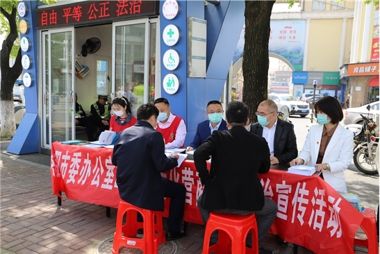 4月15日,市委办组织优化营商环境专项法治宣传活动,邀请银城律师事务所几名律师走上街头,宣讲条例政策、接受市民咨询,并将相关宣传资料送到门店业主手中。