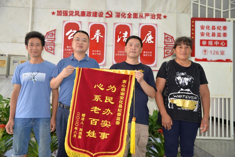 “我找了很多地方都没有解决问题,多亏纪委出手,我的补偿款才要了回来,这面锦旗代表了我们夫妇的心声!真的感谢你们!”8月13日上午,家住安化县柘溪林场神湾村的刘洪燕夫妇搭了近3小时的车船,专程来到县纪委监委信访室,把一面印有“为民办实事,心系老百姓”的锦旗送到了纪委工作人员手中。