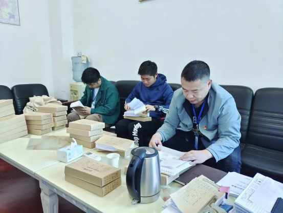 检查小组在县融媒体中心进行突击检查,查阅财务台账、餐饮票据等。