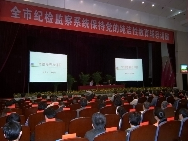 4月25日,全市纪检监察系统保持党的纯洁性教育辅导讲座举行,省纪委特邀研究员、湖南城市学院院长李建华教授应邀作专题辅导讲座。市委常委、市纪委书记黄进良要求,全市各级纪检监察干部要加强官德修养和职业道德修养,做保持党的纯洁性的忠诚实践者,一以贯之地将保持党的纯洁性教育活动抓紧抓好,抓出成效,进一步将教育活动引向深入。