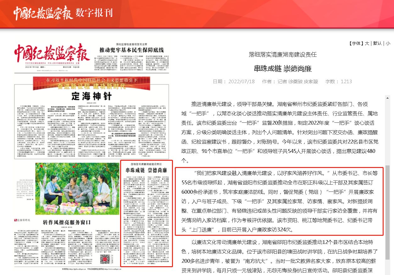 “我们把家风建设融入清廉单元建设,以好家风涵养好作风。”从市委书记、市长等55名市级领导抓起,益阳市纪委监委推动全市在职正科级以上干部及其家属签订6000余份承诺书,筑牢家庭廉洁防线。同时,督促党委(党组)“一把手”开展廉政家访,入户与班子成员、下级“一把手”及其家属拉家常、访家情、察家风。对新提拔调整、在重点单位部门、有轻微违纪或苗头性问题反映的领导干部实行家访全覆盖,并将有关情况纳入家访档案,作为考核评优依据。该市资阳、桃江等地党委书记、纪委书记带头“上门送廉”,目前已开展入户廉政家访324次。