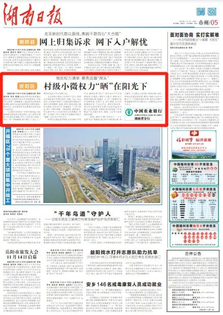 为让村级小微权力在阳光下运行,资阳区纪委监委今年联合组织、民政、人社、农业农村、乡村振兴等部门,对基层组织和基层干部权力事项摸排、梳理、研判,制定村级小微权力清单,对村务公开、党建政务、“三资”(资金、资产、资源)管理、工程招投标、惠民惠农、民生服务等6大类28项权力范围圈出“界限”,对村级工作中可能存在的廉政风险点“画像”,在村务公开栏公开。