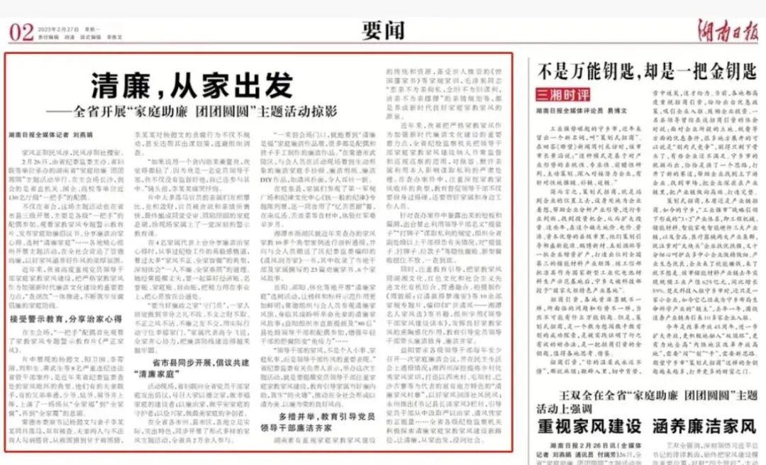 2月26日,由省纪委监委主办、省妇联等单位承办的湖南省“家庭助廉 团团圆圆”主题活动举行。在主会场长沙,到会的是省直机关、国企、高校等单位近130名厅级“一把手”的配偶。 不仅在省会,这场主题活动也在省市县三级开展,主要是各级“一把手”的配偶参加。观看家教家风专题警示教育片、发布家庭助廉倡议书、分享廉洁治家心得、选树“清廉家庭”……各地精心组织开展主题活动,在全社会营造了崇德尚廉,以好家风涵养好作风的浓厚氛围。 近年来,我省高度重视党员领导干部家庭家教家风建设,把严格家教家风作为加强新时代廉洁文化建设的重要着力点,“查剖改”一体推进,不断筑牢反腐倡廉的家庭防线。 接受警示教育,分享治家心得 在主会场,“一把手”配偶首先观看了家教家风专题警示教育片《严正家风》。 片中展现的杨懿文、阳卫国、李荐国、刘和生、龚武生等8名严重违纪违法省管干部案件,是近年来省纪委监委查处的家风败坏的典型。他们有的夫妻联手,有的兄弟串通,少爷、姑爷、舅爷齐上阵,上演了一场场从“全家福”到“全家腐”,再到“全家覆”的悲剧。 常德市委原书记杨懿文与妻子李某某同日落马,双双被查。夫妻两人与不法商人勾肩搭背,从被围猎到甘于被围猎,李某某对杨懿文的贪腐行为不仅不规劝,甚至还帮其出谋划策,逃避组织调查。 “如果说用一个贪内助来衡量我,我觉得都轻了。因为我是一名党员领导干部,我不仅没有监督好他,自己还参与其中。”镜头前,李某某痛哭忏悔。 片中大多落马官员的亲属们互相攀比,竞相敛财,官员被贪欲和亲情所裹挟,最终酿成同堂受审、同陷囹圄的家庭悲剧,给现场家属上了一堂深刻的警示教育课。 在4名家属代表上台分享廉洁治家心得时,从事过纪检工作的易毅感慨道,看过太多“家风不正、全家皆腐”的典型,深刻体会“一人不廉、全家难圆”的道理。她经常提醒丈夫,要一起算好经济账、名誉账、家庭账、自由账,把精力用在事业上,把心思放在公道处。 “要当好廉政之家‘守门员’,一家人自觉做到非分之礼不收、不义之财不取、不正之风不沾、不廉之友不交,用实际行动守住幸福家门。”家属代表高令飞说,全家齐心协力,把廉洁防线建造得越来越牢固。 省市县同步开展,倡议共建“清廉家庭” 活动现场,省妇联向全省党员干部家庭发出倡议,号召大家以德立家,做幸福家庭的建设者;以廉治家,做平安家庭的守护者;以俭兴家,做最美家庭的争创者。 在全省各市州、县市区,各地立足实际,突出特色,同步开展了形式多样的家风主题活动,全省共2万余人参与。 “一来到会场门口,就能看到‘清廉是福’家庭廉洁作品展,很多都是配偶和孩子手工制作的廉洁作品。”在常德市武陵区,与会人员在活动现场看到生动形象的廉洁家庭手抄报、廉洁剪纸、廉洁DIY作品,如清风扑面,令人耳目一新。 在桂东县,家属们参观了第一军规广场和纪律文化中心《铁一般的纪律》专题陈列展,还一同食用了“忆苦思甜”餐,在南瓜汤、苦斋菜等食材中,体验红军艰辛岁月。 湘潭市雨湖区就近年来查办的家风家教10多个典型案例进行剖析通报,并向与会人员赠送了区纪委监委编印的《清风润万家》一书,其中收录了当地干部及家属撰写的23篇劝廉家书、6个家风故事。 岳阳、邵阳、怀化等地开展“清廉家庭”选树活动,让榜样和标杆示范作用更加鲜明;常德组织与会人员参观清廉家风馆,身临其境聆听革命先辈的清廉家风故事;益阳组织市直新提拔及“80后”县处级领导干部和配偶参加,增强年轻干部的拒腐防变“免疫力”…… “领导干部的家风,不是个人小事、家庭私事,而是领导干部作风的重要表现。”省纪委监委有关负责人表示,举办这次主题活动,就是要提醒党员领导干部注重家庭家教家风建设,教育引导家属当好廉内助,筑牢“防火墙”,推动在全社会形成以清为美、以廉为荣的良好风尚。 多措并举,教育引导党员领导干部廉洁齐家 湖南素有重视家庭家教家风建设的传统和资源,备受世人推崇的《曾国藩家书》等家规家训,毛泽东同志“恋亲不为亲徇私,念旧不为旧谋利,济亲不为亲撑腰”的亲情规矩等,都是养成新时代良好家庭家教家风的源泉。 近年来,我省把严格家教家风作为加强新时代廉洁文化建设的重要着力点,全省纪检监察机关把领导干部家庭家教家风建设纳入日常监督和巡视巡察的范围,对纵容、默许亲属利用本人影响谋取私利的严肃处理。在查办案件中,注重深挖家教家风败坏的典型,教育督促领导干部不仅要自身过得硬,还要管好家属和身边工作人员。 针对查办案件中暴露出来的短板和漏洞,出台禁止利用领导干部名义“提篮子”“打牌子”谋取私利的规定,组织全省副处级以上干部报告有关情况,对“提篮子、打牌子、拉款子”等隐性腐败、新型腐败扭住不放、一查到底。 同时,注重教育引导,把家教家风同湖湘文化、红色文化和社会主义先进文化有机结合、贯通融合。拍摄制作《周敦颐:官清赢得梦魂安》等10余部家规专题片,编印《旷世清风——湘潭名人家风选》等书籍,组织学用《领导干部家风建设读本》,发挥良好家教家风的熏陶感化作用,教育引导党员领导干部带头廉洁修身、廉洁齐家。 益阳要求各级领导干部每年至少召开一次家庭廉洁会议,并在民主生活会上通