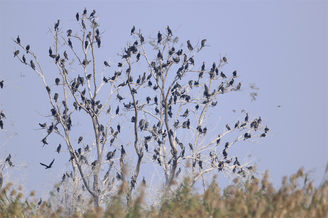 深秋时节,随着气温渐低,南洞庭湖自然保护区南县舵杆洲区域迎来首批越冬候鸟,他们在此休憩觅食,为整个湿地增添了一份活力与生机。图为普通鸬鹚在枝头休憩。(益阳南洞庭湖自然保护区南县管理局供 高宏 摄)