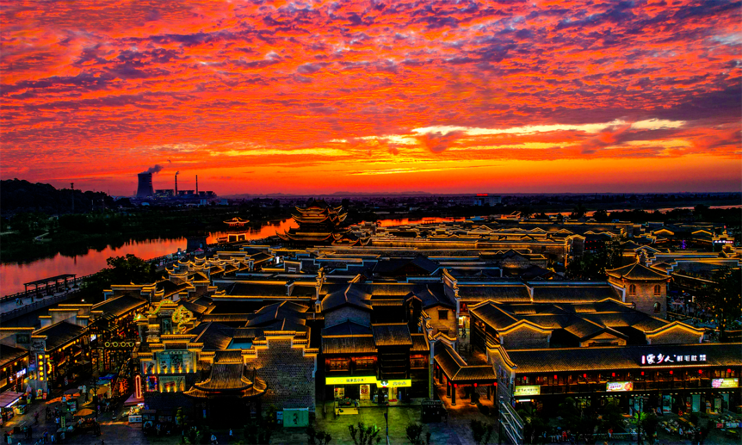 漫天红霞如打翻的调色盘,将天与江都染成了绯红。资阳区明清古巷的灯火在青瓦间流转,一幅岁月与流光碰撞的绝美画卷,在资江畔徐徐展开。(资阳区大码头街道供 王琼辉 摄)