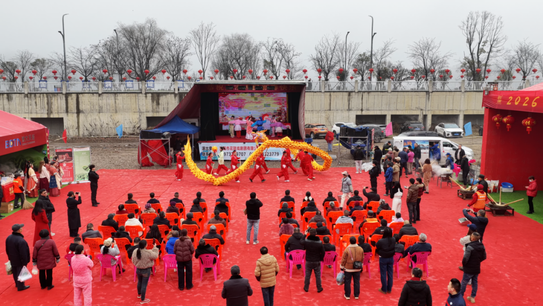 在2026年资阳新春年味大集现场,舞龙队身着红衣,手舞金黄巨龙腾跃翻飞,舞台上益阳市花鼓戏剧团的演员们轮番登场,婉转的唱腔与灵动的身段演绎着传统故事,市民们齐齐驻足观赏,红灯笼与涌动的人群相映,年俗盛宴的热闹氛围拉满。(资阳区融媒体中心供 罗娟 摄)
