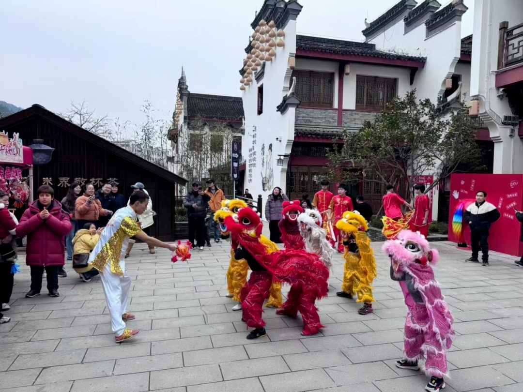 “梅山寻味・年味安化”活动在安化县东坪镇黄沙坪老街青创街区拉开帷幕。活动现场,色彩斑斓的舞狮在人群中央翻腾跳跃,古色古香的老街建筑与热闹纷呈的民俗表演相映成趣,处处洋溢着梅山大地的独特年味。(安化县融媒体中心供 李若妍 摄)