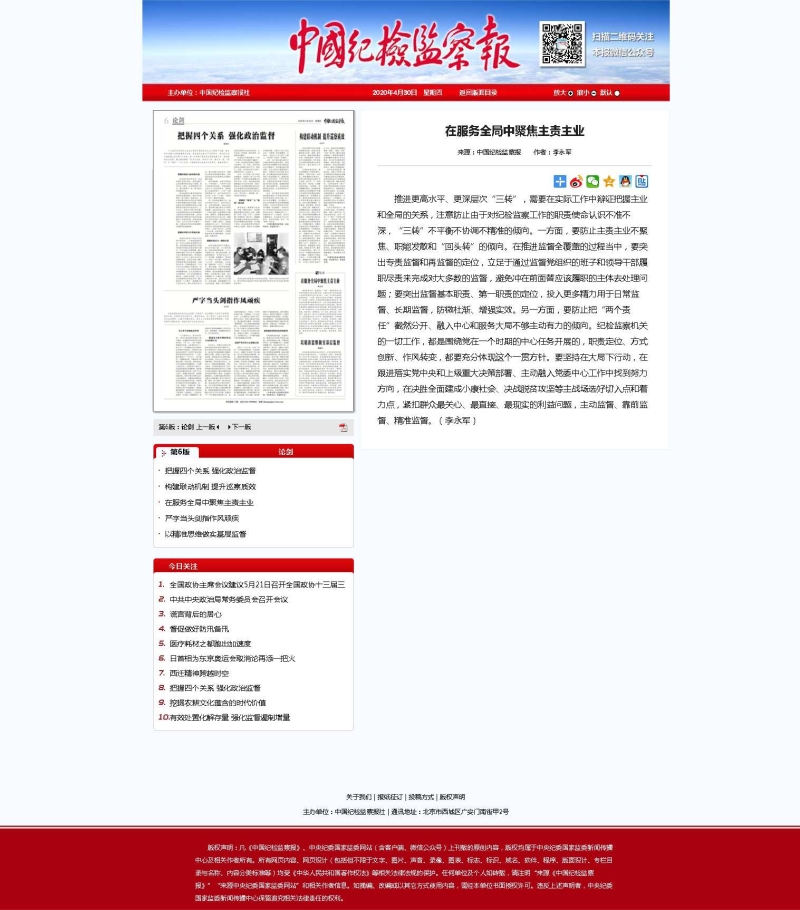 推进更高水平、更深层次“三转”,需要在实际工作中辩证把握主业和全局的关系,注意防止由于对纪检监察工作的职责使命认识不准不深,“三转”不平衡不协调不精准的倾向。一方面,要防止主责主业不聚焦、职能发散和“回头转”的倾向。在推进监督全覆盖的过程当中,要突出专责监督和再监督的定位,立足于通过监督党组织的班子和领导干部履职尽责来完成对大多数的监督,避免冲在前面替应该履职的主体去处理问题;要突出监督基本职责、第一职责的定位,投入更多精力用于日常监督、长期监督,防微杜渐、增强实效。另一方面,要防止把“两个责任”截然分开、融入中心和服务大局不够主动有力的倾向。纪检监察机关的一切工作,都是围绕党在一个时期的中心任务开展的,职责定位、方式创新、作风转变,都要充分体现这个一贯方针。要坚持在大局下行动,在跟进落实党中央和上级重大决策部署、主动融入党委中心工作中找到努力方向,在决胜全面建成小康社会、决战脱贫攻坚等主战场选好切入点和着力点,紧扣群众最关心、最直接、最现实的利益问题,主动监督、靠前监督、精准监督。【中国纪检监察报】在服务全局中聚焦主责主业